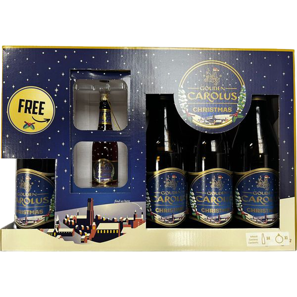 Forkæl ølelskeren med en gave, der emmer af julestemning og belgisk brygkunst. Denne smukt udformede Gouden Carolus Christmas gavekasse fra det anerkendte Brouwerij Het Anker indeholder fire flasker af den ikoniske juleøl samt en dekorativ julekugle, der matcher øllens klassiske etiketdesign.